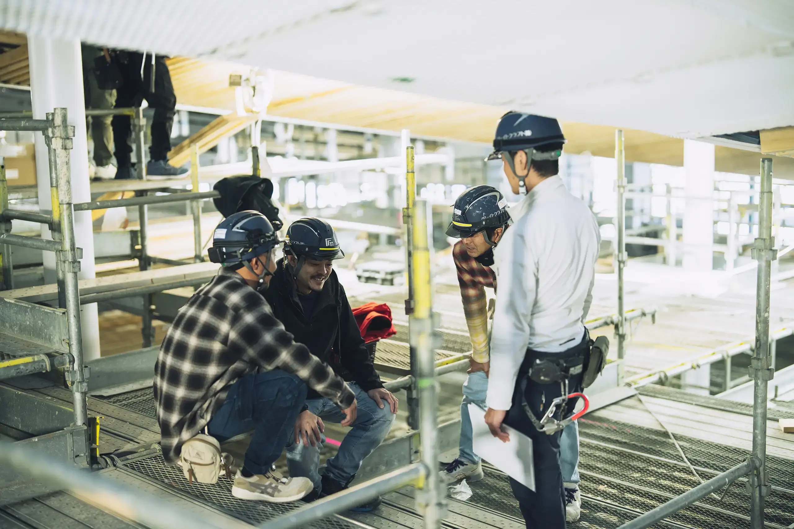 - 現場に集合し、その日の作業内容や安全確認を行います。作業スタッフと打ち合わせをして、1日の流れを共有します。